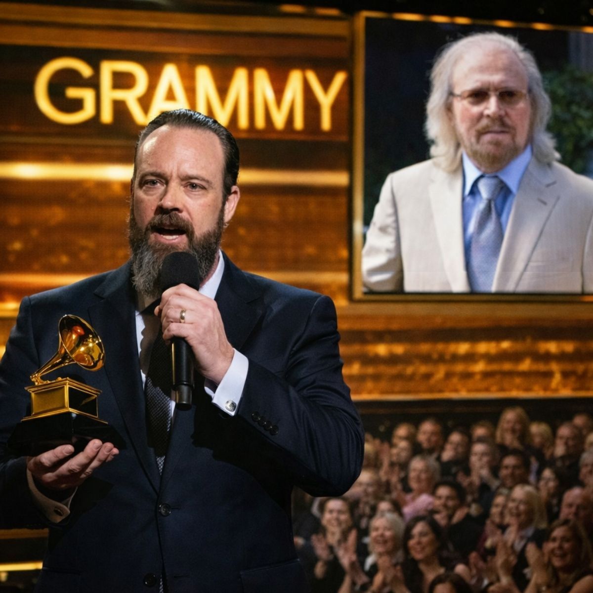 The atmosphere inside the ceremony hall shifted the moment Stephen Gibb stepped forward to accept the Gold Award for Best Vocal Performance at the GRAMMY Awards, honoring his legendary father, Barry Gibb. What had been a room alive with applause and anticipation fell into a sudden, reverent hush—one of those rare silences that feels heavy with meaning, asking everyone present to listen not just with their ears, but with their hearts.